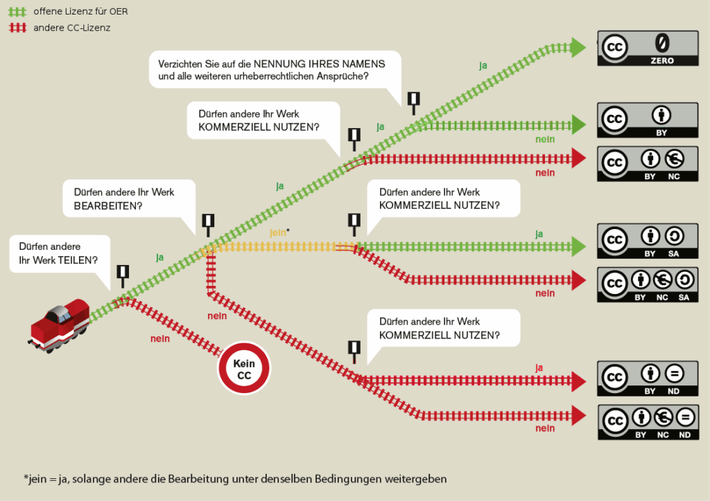 Nur ein Teil der CC–LizenzenLizenzen geben Informationen über rechtliche Aspekte, Urheb More sind offene LizenzenOffene Lizenzen sind standardisierte Nutzungslizenzen, die a More. Im engeren Sinne sind das nur die im Bild grün markierten LizenzenLizenzen geben Informationen über rechtliche Aspekte, Urheb More. Diese sind besonders für OEROpen Educational Resources (OER), auf Deutsch offene Bildung More geeignet und sollten vorrangig verwendet werden. Bedenken Sie, dass ein Verbot der kommerziellen Nutzung auch bedeutet, dass eine OEROpen Educational Resources (OER), auf Deutsch offene Bildung More z.B. nicht an privaten Hochschulen verwendet werden darf.