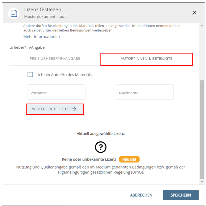 Weiterhin haben Sie in diesem Fenster auch die Möglichkeit, mehrere Autoren sowie weitere an der Entwicklung des Materials beteiligte Personen, z.B. Herausgeber, Grafiker, sichtbar zu machen. Wählen Sie hierfür „Weitere Beteiligte“ unterhalb des Eingabefelds aus.